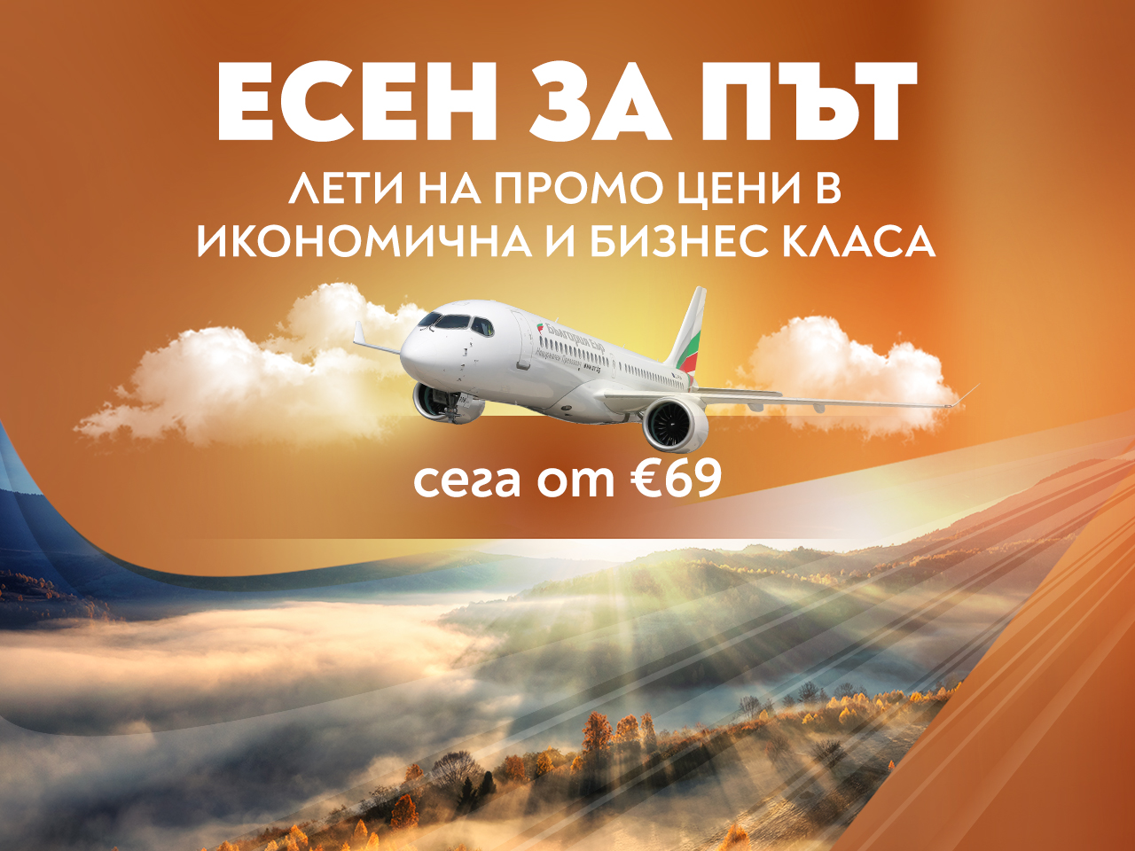 Националната авиокомпания стартира специална есенна кампания, с която предлага намалени цени на самолетни билети до 11 европейски дестинации. Промоционалните тарифи ще бъдат в продажба от 20 октомври до 3 ноември, а пътуванията могат да се осъществят в периода от 27 октомври до 15 декември 2025 г.