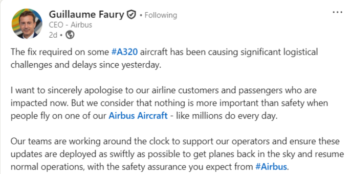 „Искам искрено да се извиня на нашите авиоклиенти и пътници, които са засегнати в момента. Но считаме, че нищо не е по‑важно от безопасността, когато хората летят с един от нашите самолети Airbus — както милиони правят всеки ден,“ заяви Гийом Фюри, главен изпълнителен директор на Airbus, в публикация в LinkedIn.